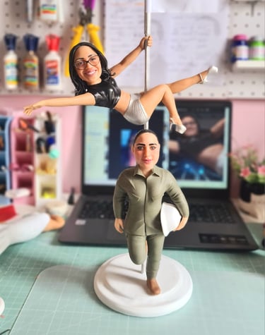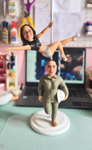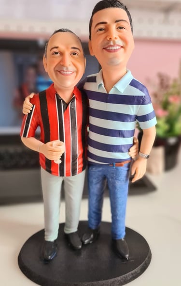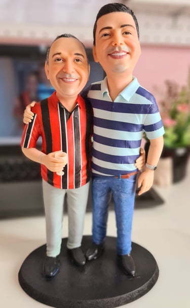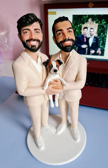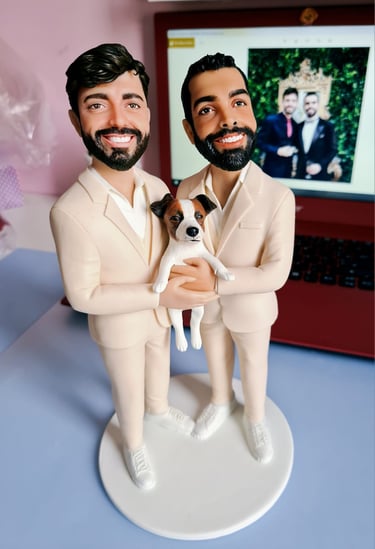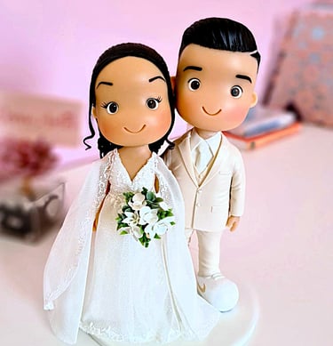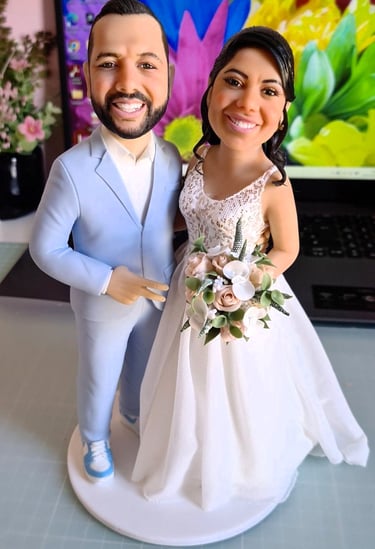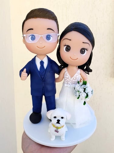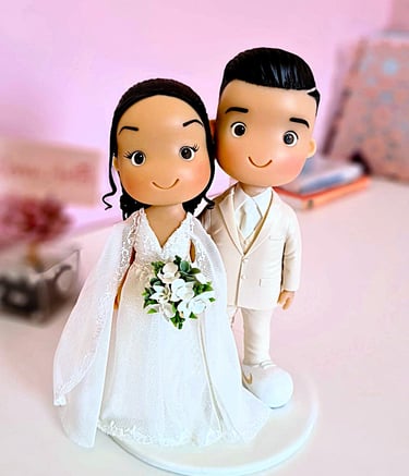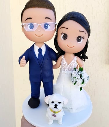 Cada casal é único, e seus noivinhos também! Modelados à mão com porcelana fria (biscuit), crio peças totalmente personalizadas para o grande dia. A partir das fotos do vestido, terno, buquê e outros detalhes enviados pelos noivos, esculpo cada personagem com todo carinho, exatamente como estarão no casamento.